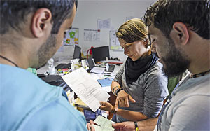 Ins Gespräch vertieft – auf dem Symbolbild sieht man eine Sozialarbeiterin, die zwei junge Männer berät. In Besigheim ist das Team der Caritas für Anliegen der Geflüchteten da. Foto: KNA |